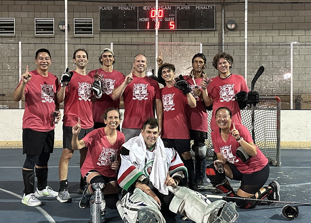 The structure of the SDFHL playoffs is probably not perfect, with the double elimination format meaning that the Final could very well be a back-to-back brawl for it all, but there is something to be said about managing to build a ‘rivalry’ over the course of a mere fourteen weeks of play. The maximum number of times any one team can face the same opponent in this league is four, and Captain Carl Vankoughnett’s ‘CarliforNeons’, and Captain Wendy Enright’s ‘Gilda Redner’ hit that cap, starting with Neon’s 5-1 regular season win back in Week Three. Neon was without the services of Justin Hepler and Mark Nagy in that convincing first meeting win, but Red was without Andy Strathman, Jon Zygelman, and Owen Perks…so, maybe not the best gauge of how the rest of this sizzling series would settle out. Both teams were at full strength (well…almost…Elyse Shattuck was in for her sister Shelby) when Red handed Neon a 4-2 revenge dish that sent the former on to the Final and the latter to the Losers’ Bracket, but after Neon survived a close contest with number two, Baby Blue, we knew we would be treated to at least one more clash of these two titans ‘for all the marbles’. Neon, of course, would need to beat Red not once, but twice to capture the Cup, while Red would just need to repeat their feat from two weeks prior…just one more win to win it all. Neon was on the front foot early, outshooting Red 9-2 through the first period of play, and Ryan Karns finally found twine behind newly-minted goalie and professional Jon Cima stand-in, John Kushneryk, to put the top-seeded underdogs on the board first at 1:20 (Darin Cerasuolo & Jim LaGrossa). Young Darin quickly doubled Neon’s lead at 0:47 (Captain Vankoughnett), leaving Red reeling going into the first break. Amazingly enough, Red committed three penalties in that first ten minute chunk, but both of Neon’s goals game at even strength. Owen Perks produced Red’s first response at 6:27 in the second (Jon Zygelman & Captain Enright), and with the shot count starting to find level (just 9-7 in favor of Neon in the second), it was clear that Red was pushing hard to make this a one and done final showdown. Red held a 12-4 shot edge in the third, and Perks made one of those dozen darts pay off with 7:37 to play (Zygelman & Andy Strathman) to knot the score at twos and set up a frenetic fight to the finish. Both John Kushneryk (19/22) and Chuck Bender (19/21) remained stout and solid under the third period (literal and figurative) heat, but someone would have to emerge a hero in this one, and that someone was Neon’s Captain Vankoughnett. A scrambling series in front of Red’s net saw the ball bound from Shelby Shattuck to Darin Cerasuolo to the Vankoughnett’s backhand in front…back of the net…3-2 Neon with just seven ticks left. Neon rejoiced…Red (and, honestly, the volunteer officials) sighed heavily, and steeled themselves for the rematch…the fourth and final installment of this forged in fire rivalry…